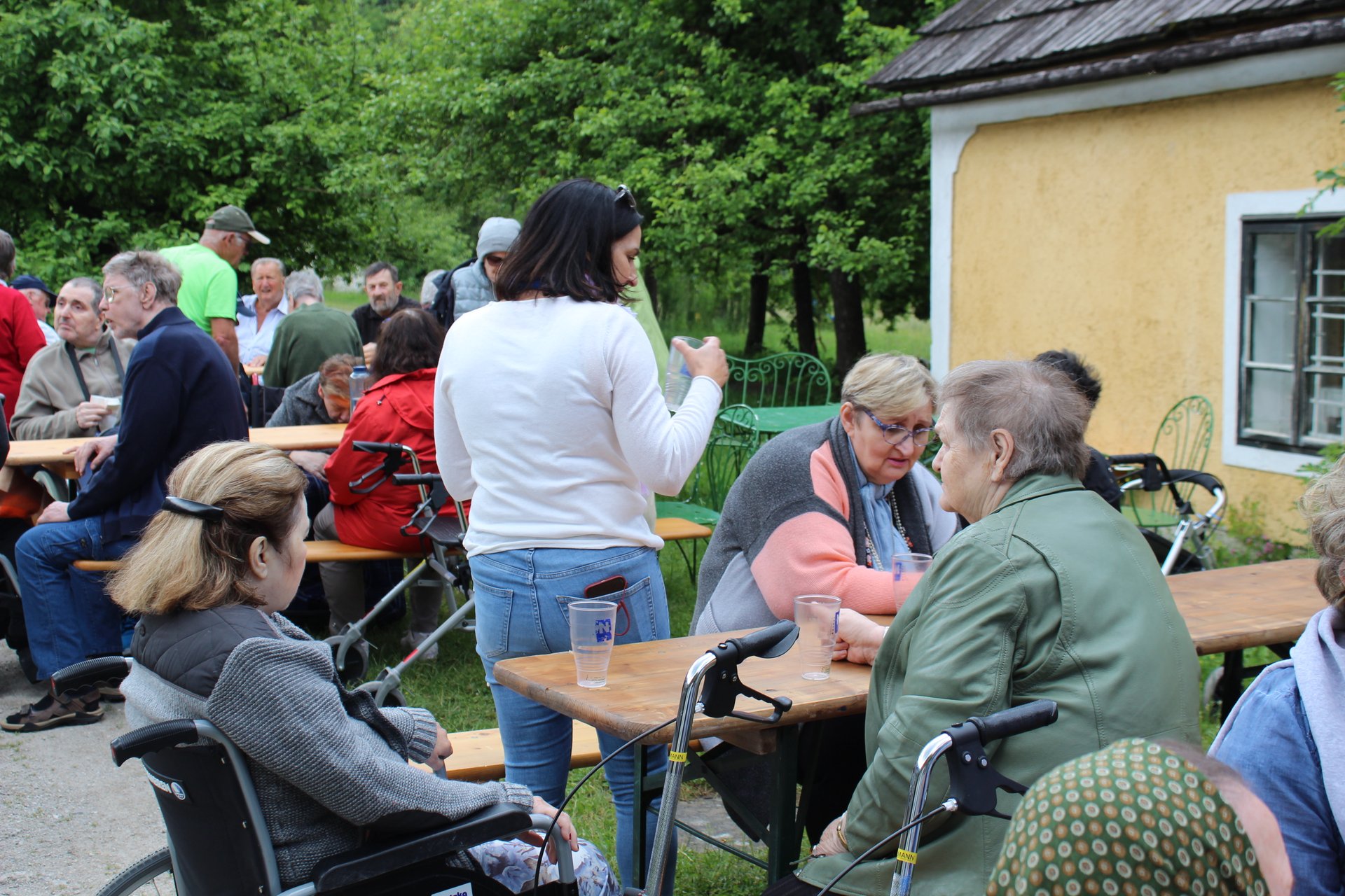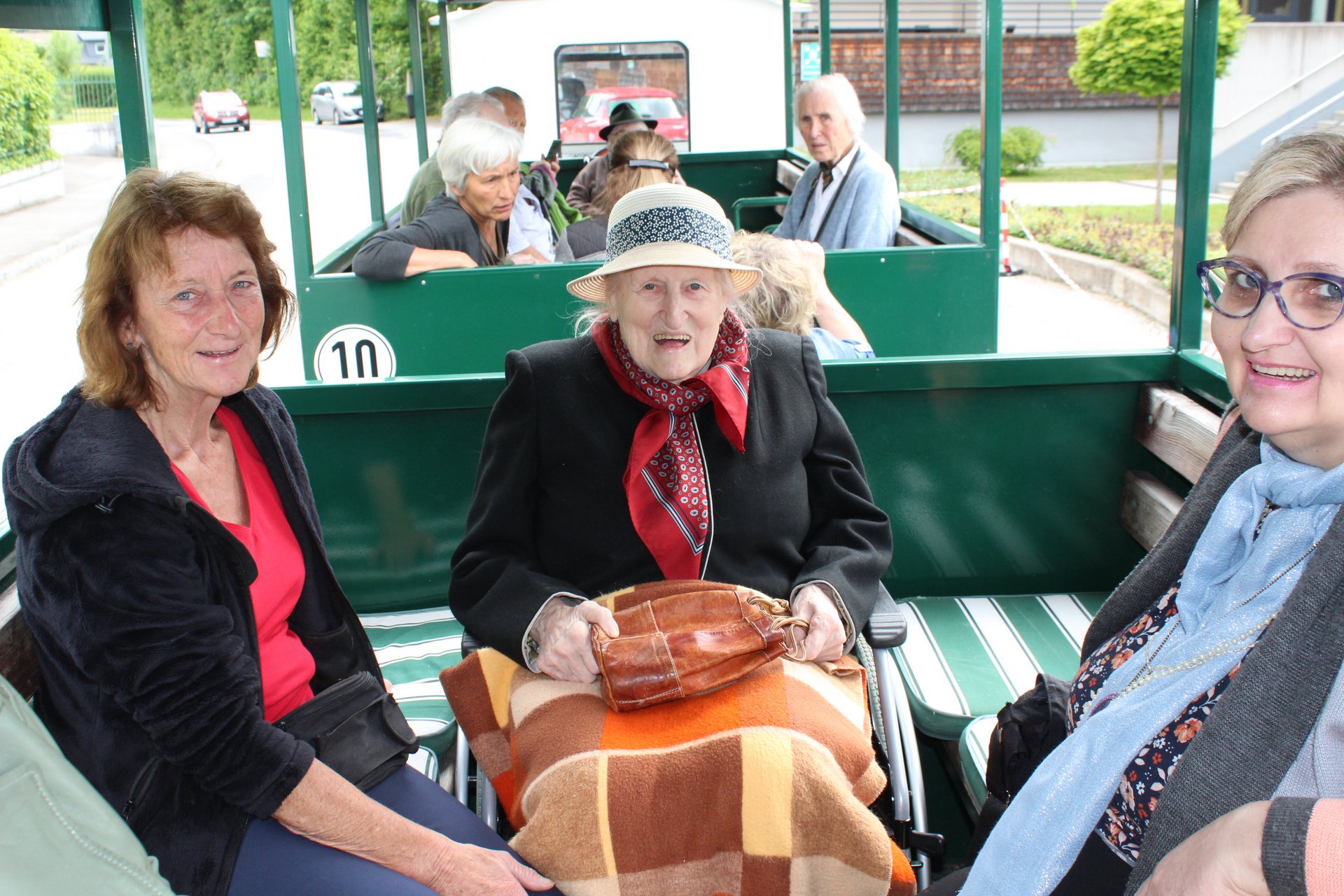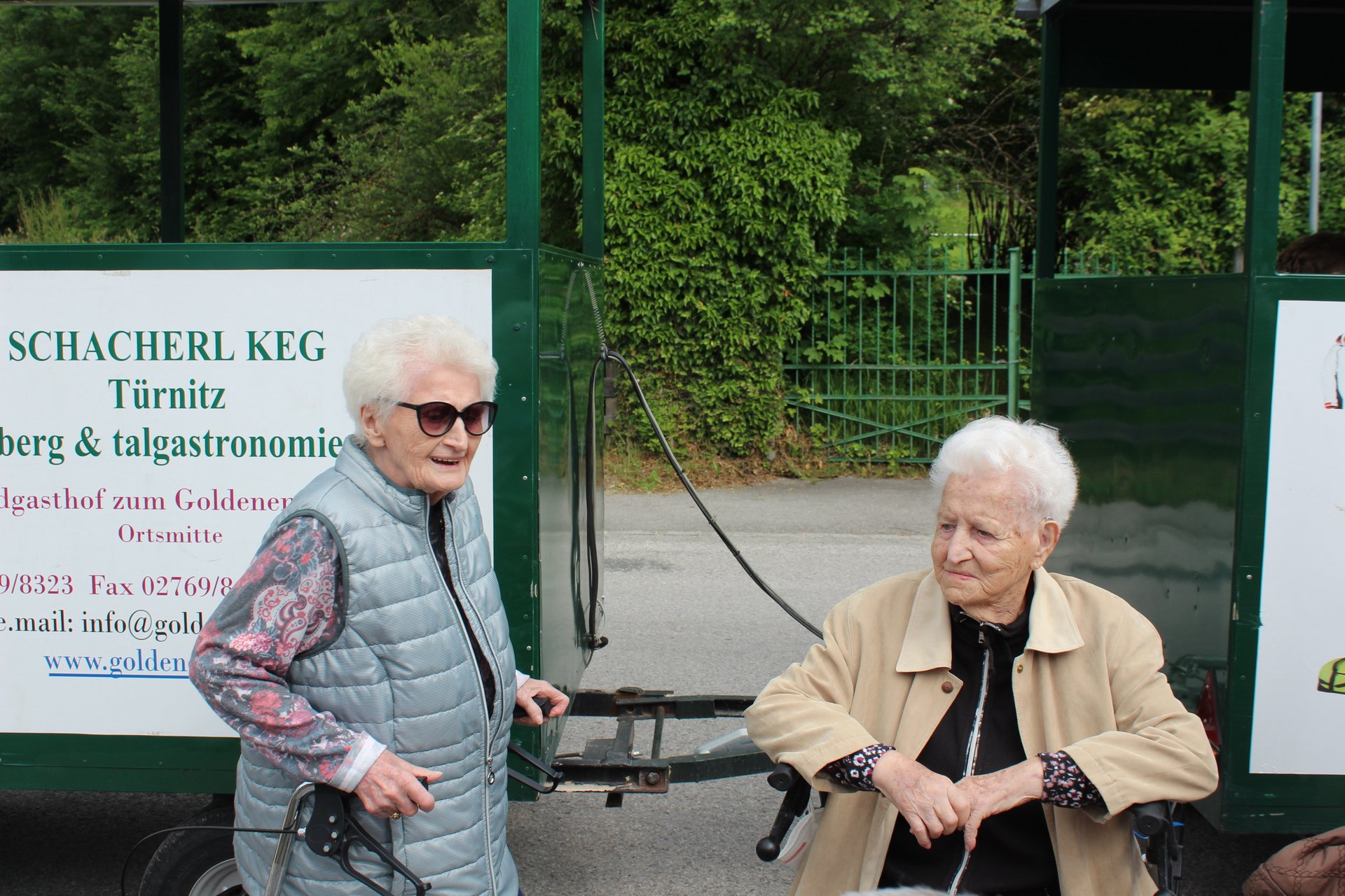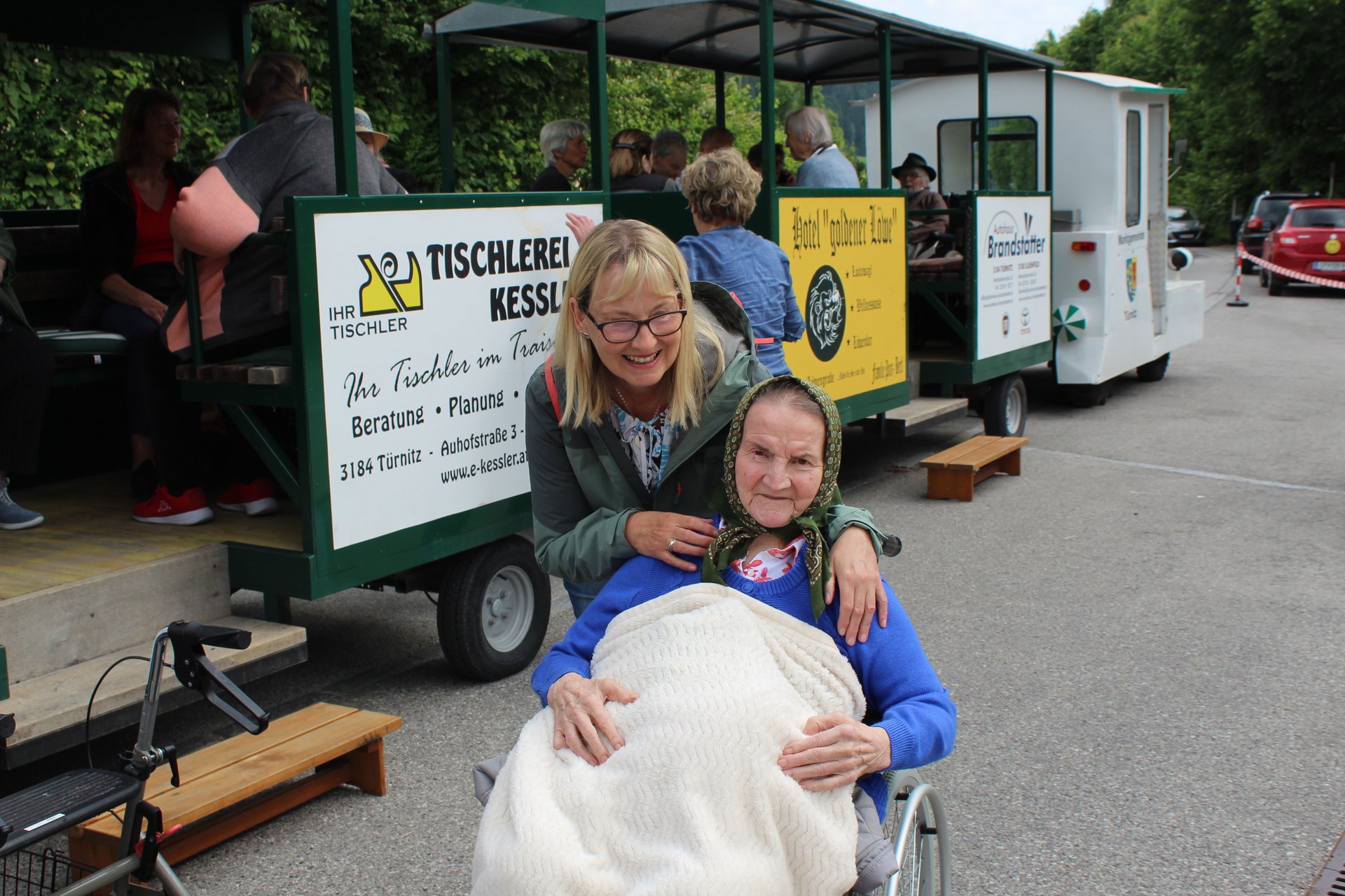 Am 14.06.2023 machten unsere Bewohnerinnen und Bewohner einen Ausflug mit dem Bummelzug. Die Bewohnerinnen und Bewohner, sowie ehrenamtliche Mitarbeiterinnen und Mitarbeiter wurden mit dem Bummelzug vor dem PBZ abgeholt. Unser erstes Ziel war der Traisengraben zur Fam. Anzberger (vulgo Hofbauer), wo wir ein kleines Picknick unter Tieren hatten, das schon etwas ganz Besonderes war. Danach fuhren wir zu einem großartigen Mittagessen in die Plöttigmühle der Fam. Sieber. Dieser Ausflug wäre ohne die vielseitige Hilfe unserer Mitarbeiter/innen und Ehrenamtsmitarbeiter/innen nicht möglich gewesen. Alleine der extra Aufwand durch die Beförderung der Rollstühle und Rollatoren nahm großes Einfallsreichtum in Anspruch. Somit konnten auch unsere nicht so mobilen Bewohner/innen diesen schönen Tag im Grünen genießen.
