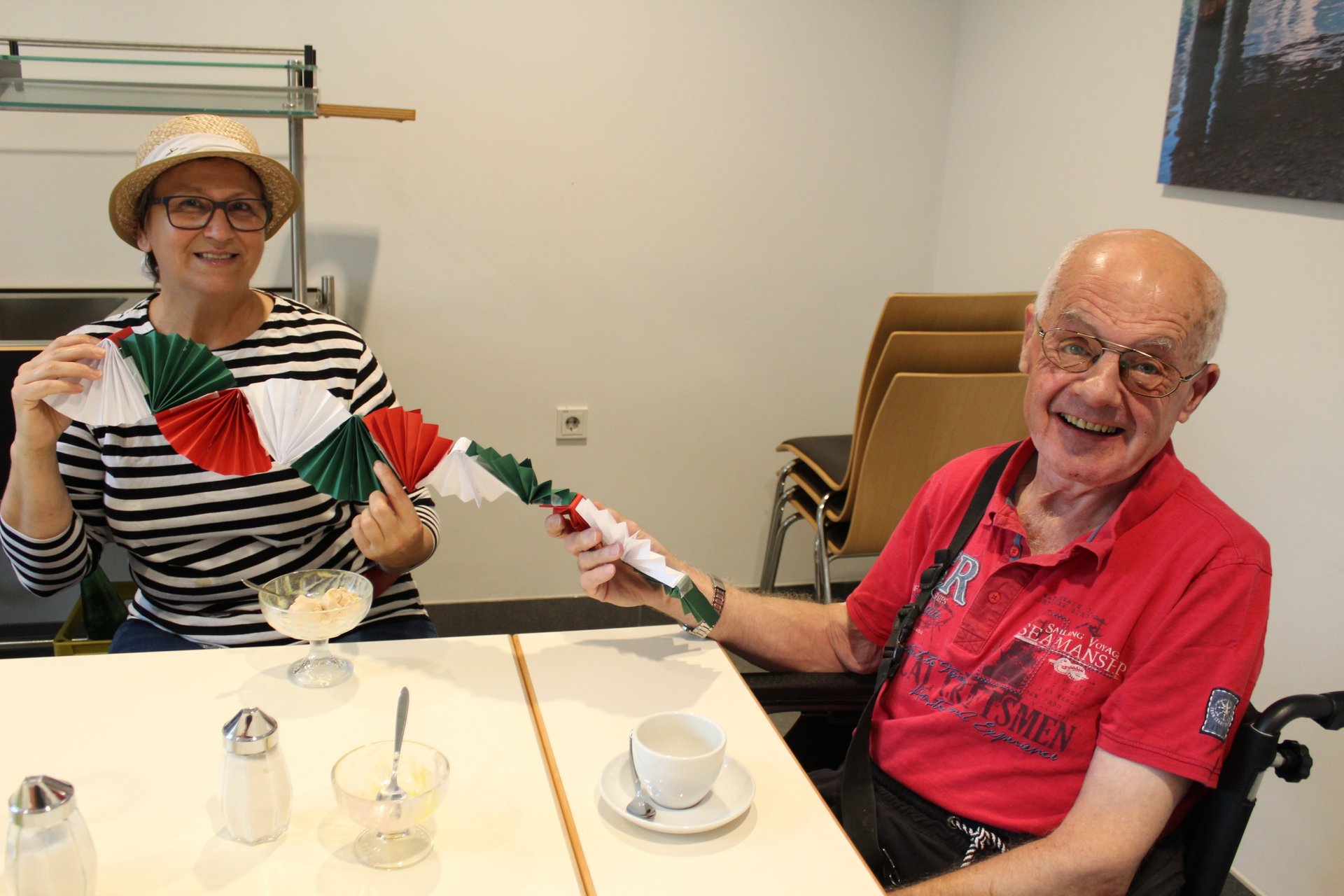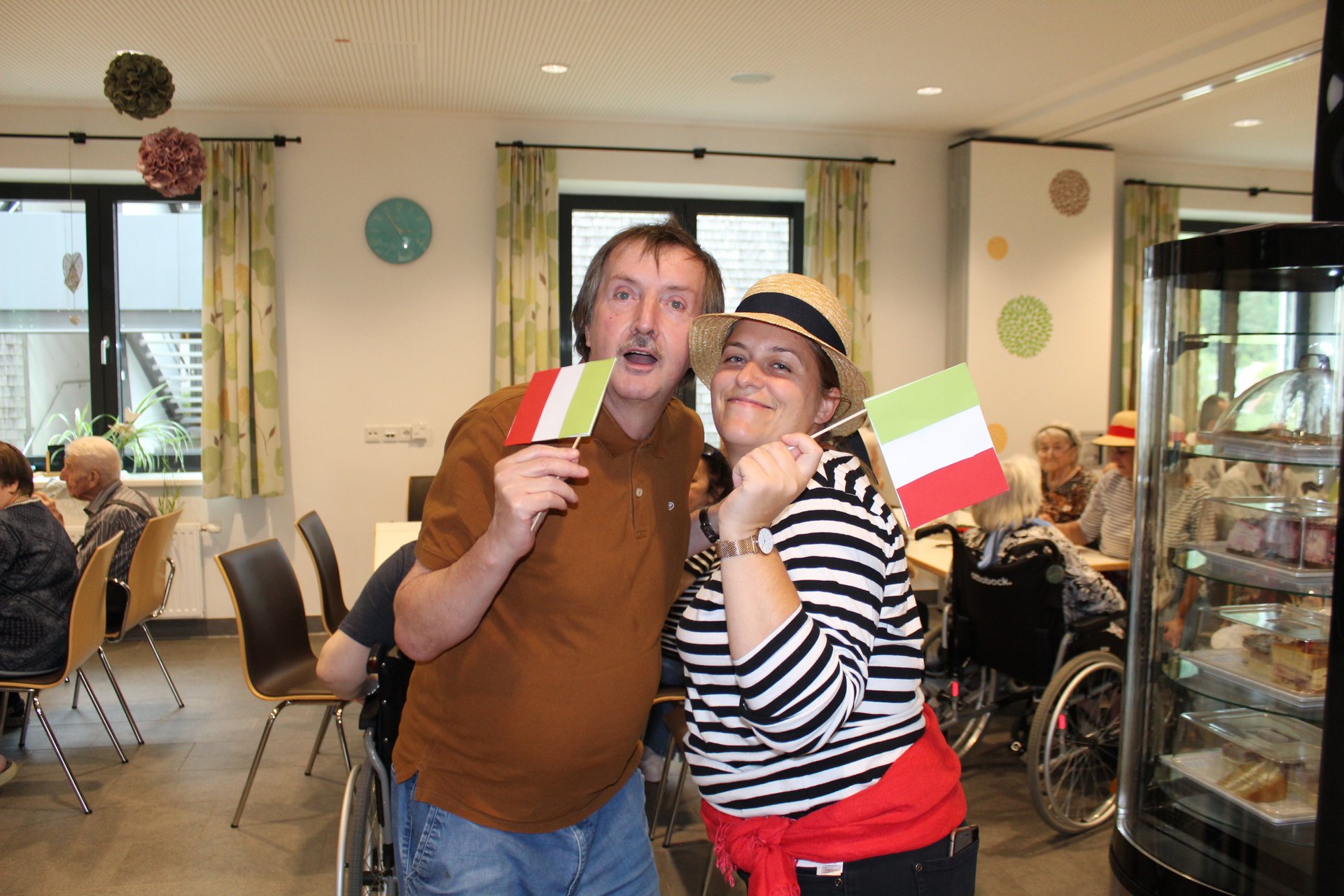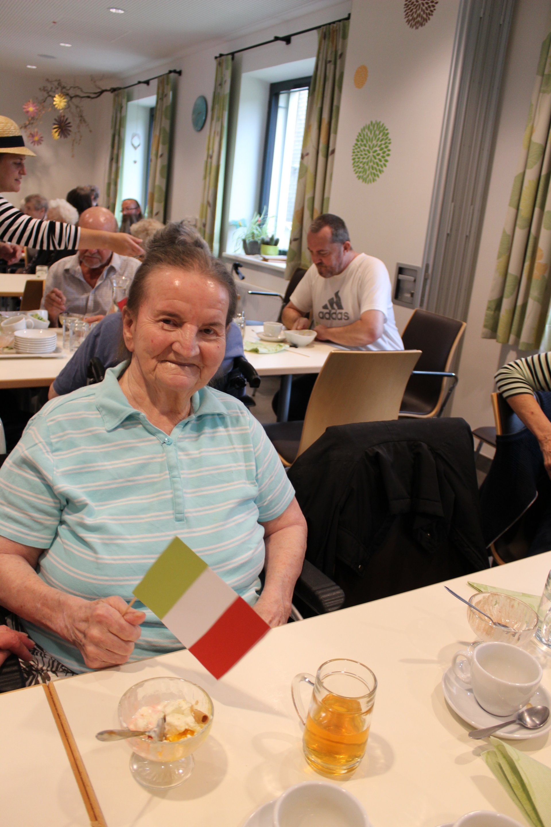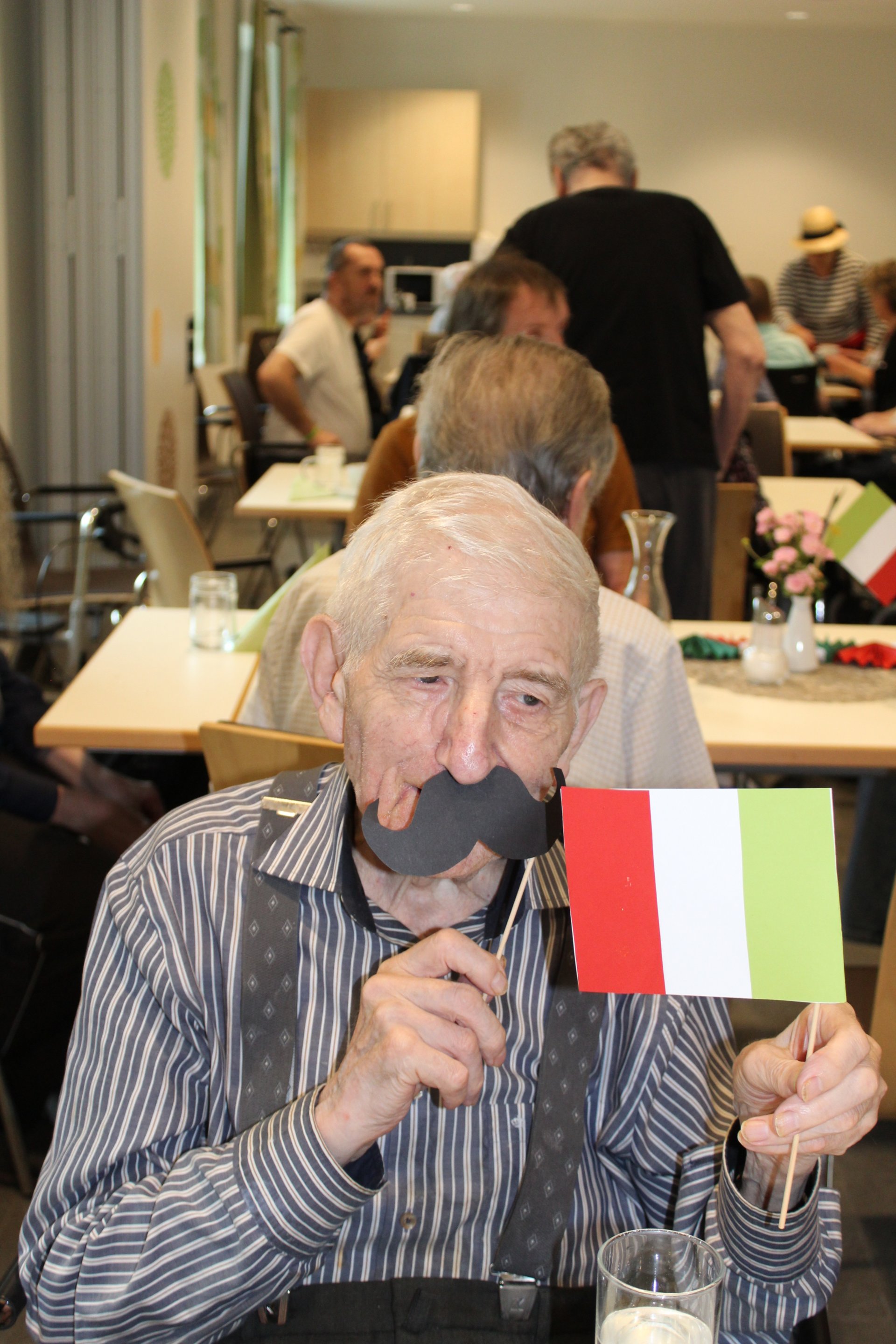 Am 19.09.2023 läutete das Raba Café im PBZ, mit einem kleinen Fest, das Ende der Eissaison ein. Unsere Bewohnerinnen und Bewohner bastelten für diesen Anlass kleine italienische Fahnen und lustige Schnurrbärte. Mit italienischer Musik untermalt, durften sich unsere Bewohnerinnen und Bewohner an Eis- und Café- Spezialitäten erfreuen. Unsere Mitarbeiterinnen und Mitarbeiter, die ehrenamtlichen Mitarbeiterinnen und Mitarbeiter, sowie unsere Bewohnerinnen und Bewohner tanzten die überschüssigen Kalorien danach auf der Tanzfläche wieder ab und hatten sichtlich Spaß dabei.