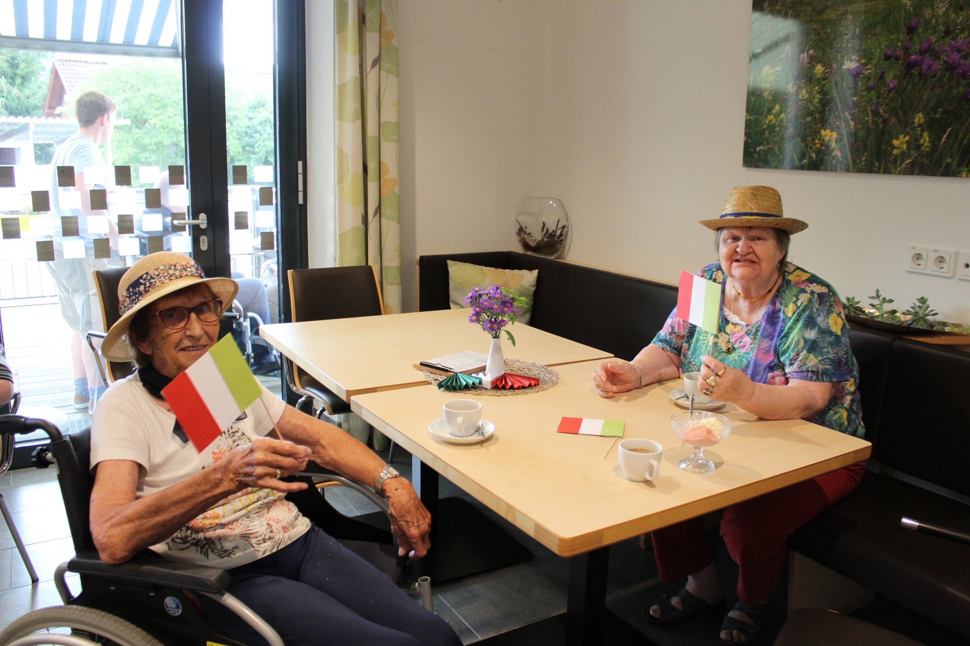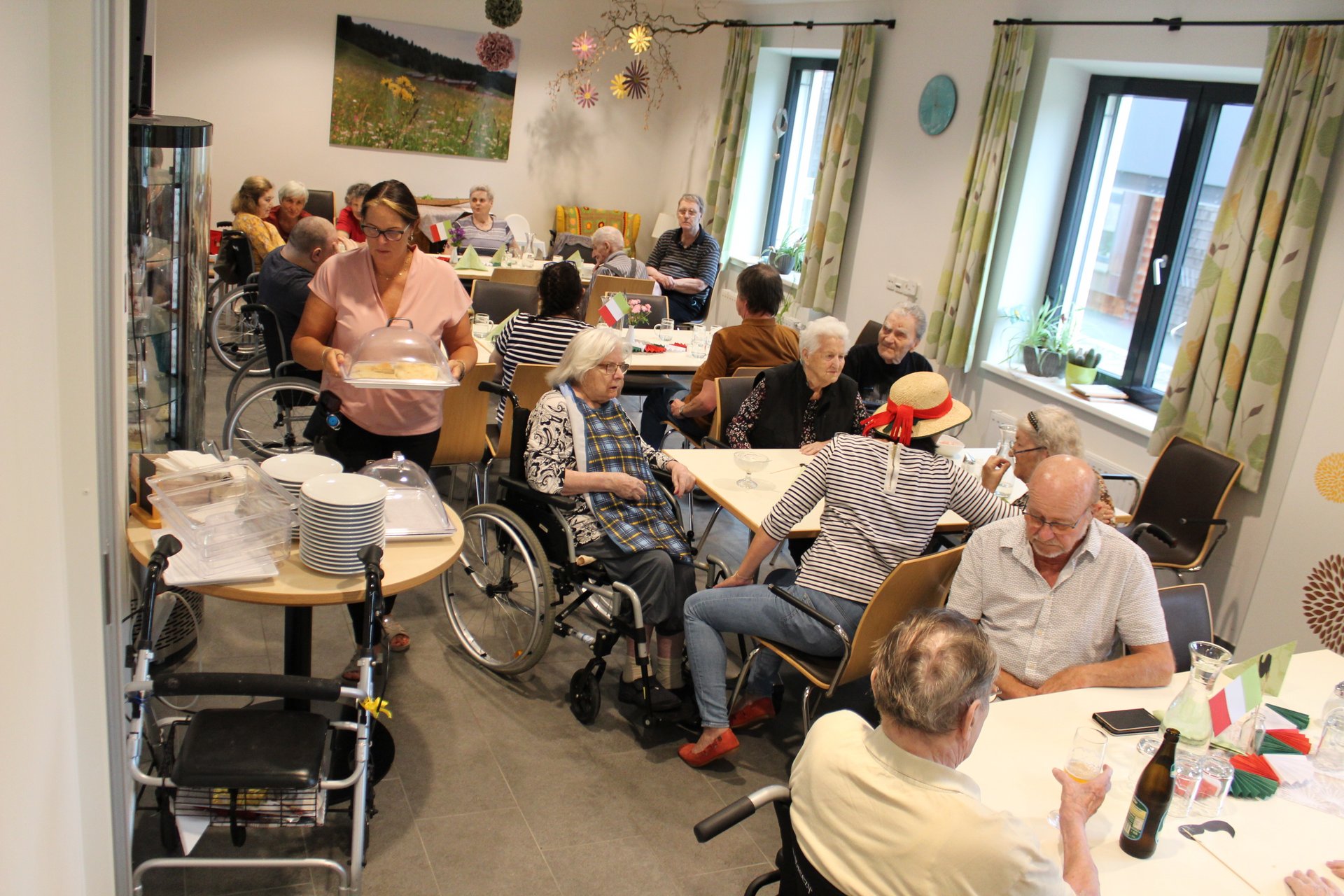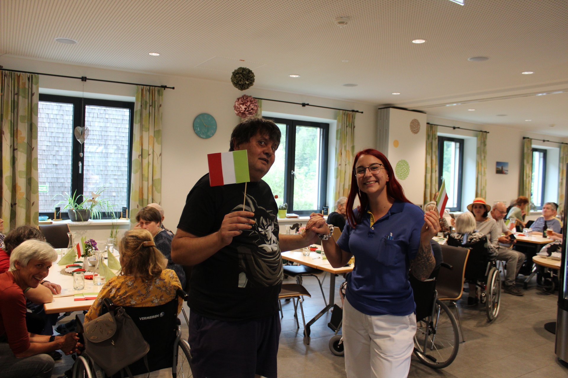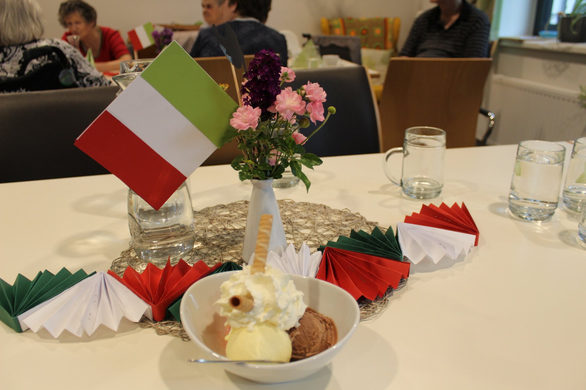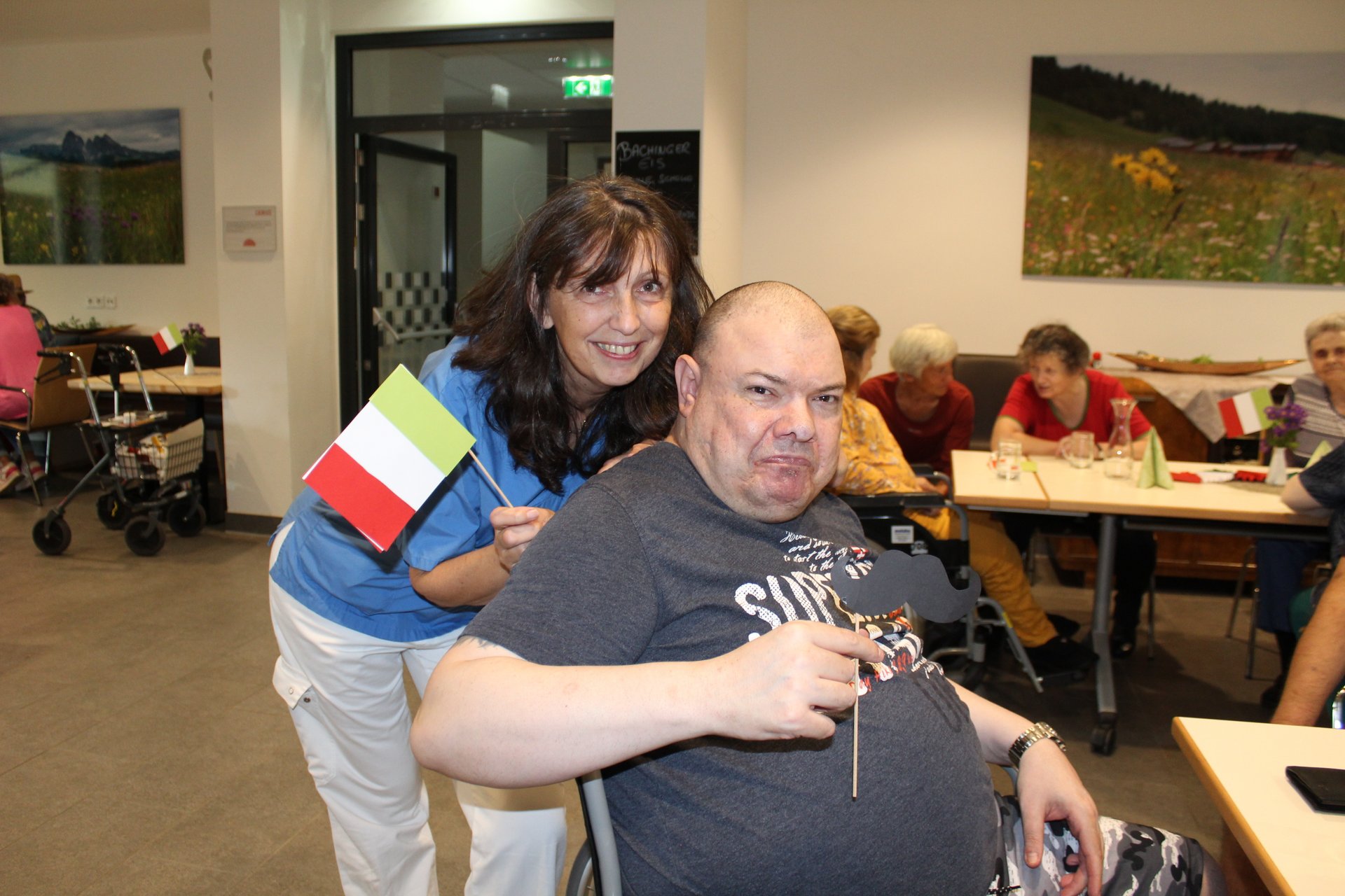 Am 19.09.2023 läutete das Raba Café im PBZ, mit einem kleinen Fest, das Ende der Eissaison ein. Unsere Bewohnerinnen und Bewohner bastelten für diesen Anlass kleine italienische Fahnen und lustige Schnurrbärte. Mit italienischer Musik untermalt, durften sich unsere Bewohnerinnen und Bewohner an Eis- und Café- Spezialitäten erfreuen. Unsere Mitarbeiterinnen und Mitarbeiter, die ehrenamtlichen Mitarbeiterinnen und Mitarbeiter, sowie unsere Bewohnerinnen und Bewohner tanzten die überschüssigen Kalorien danach auf der Tanzfläche wieder ab und hatten sichtlich Spaß dabei.