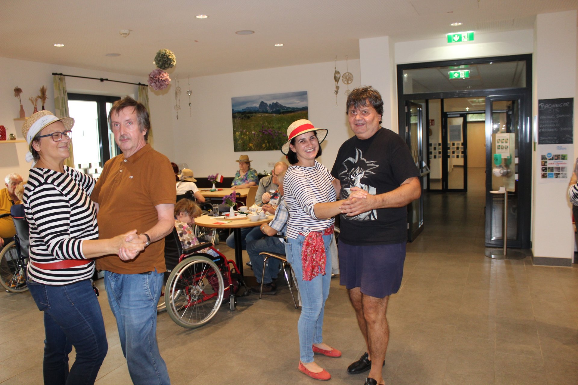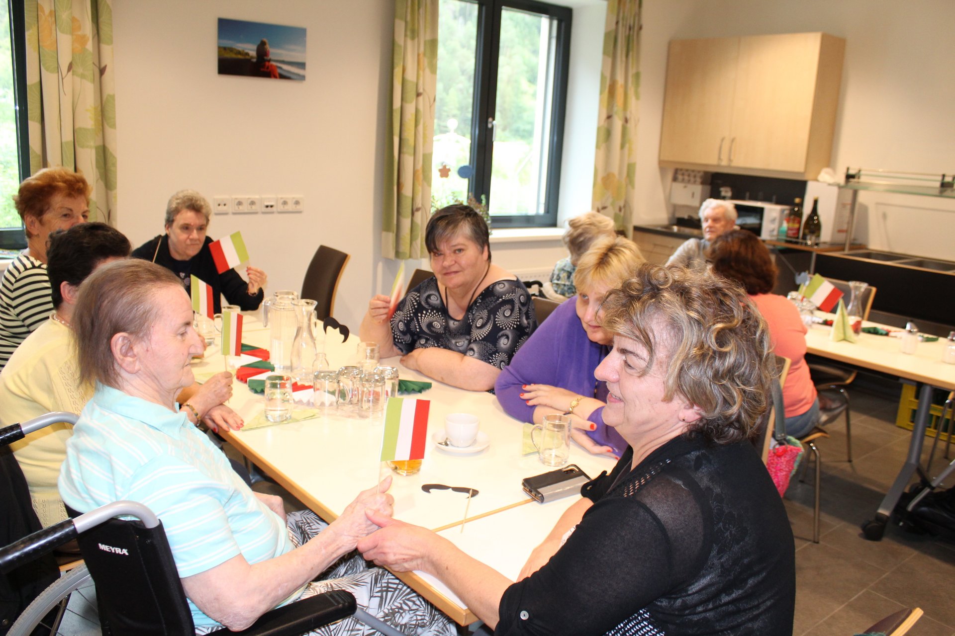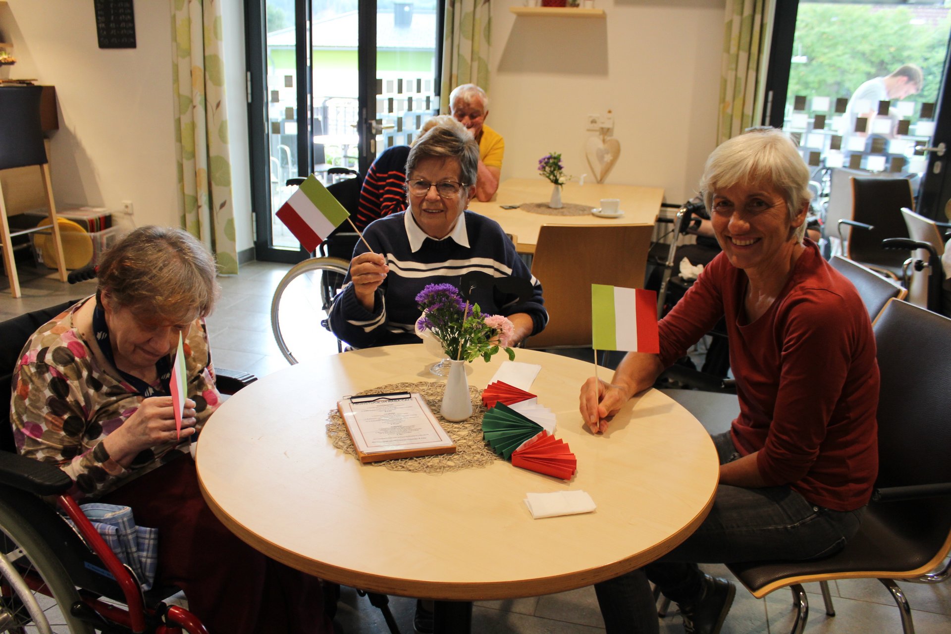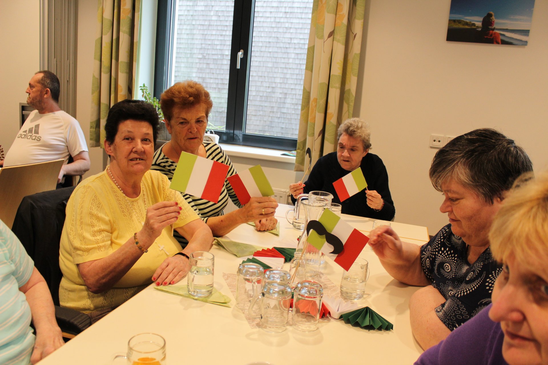 Am 19.09.2023 läutete das Raba Café im PBZ, mit einem kleinen Fest, das Ende der Eissaison ein. Unsere Bewohnerinnen und Bewohner bastelten für diesen Anlass kleine italienische Fahnen und lustige Schnurrbärte. Mit italienischer Musik untermalt, durften sich unsere Bewohnerinnen und Bewohner an Eis- und Café- Spezialitäten erfreuen. Unsere Mitarbeiterinnen und Mitarbeiter, die ehrenamtlichen Mitarbeiterinnen und Mitarbeiter, sowie unsere Bewohnerinnen und Bewohner tanzten die überschüssigen Kalorien danach auf der Tanzfläche wieder ab und hatten sichtlich Spaß dabei.