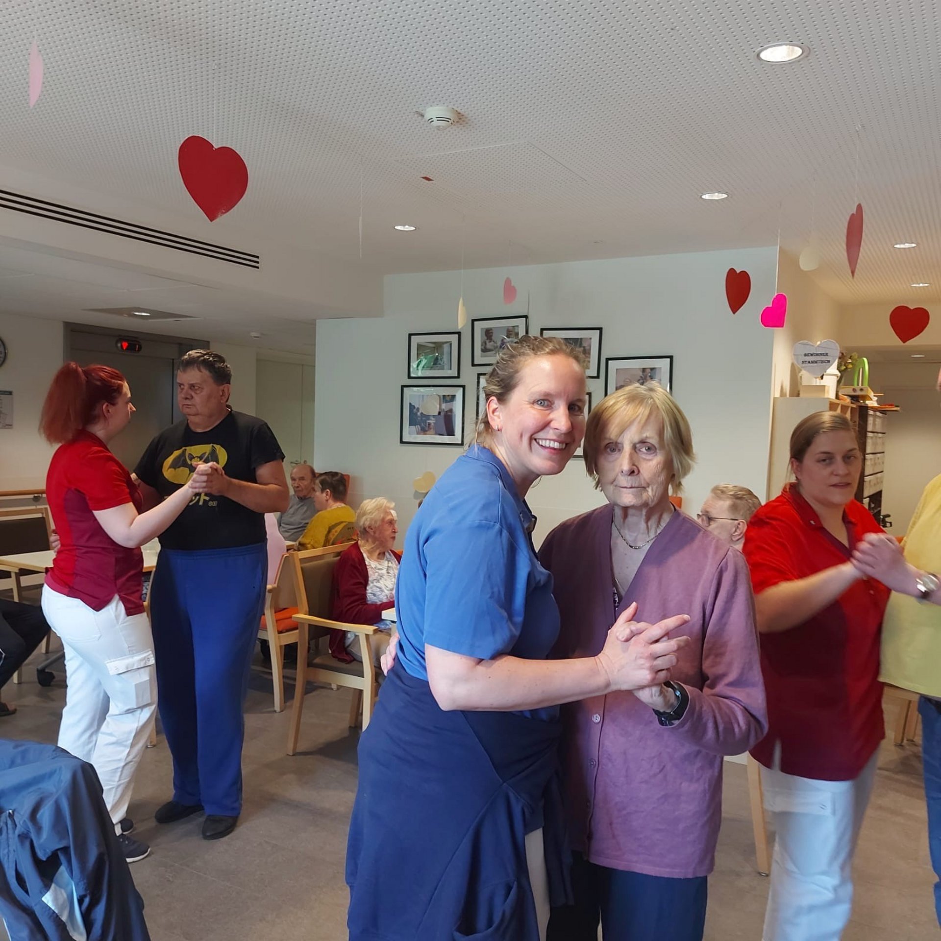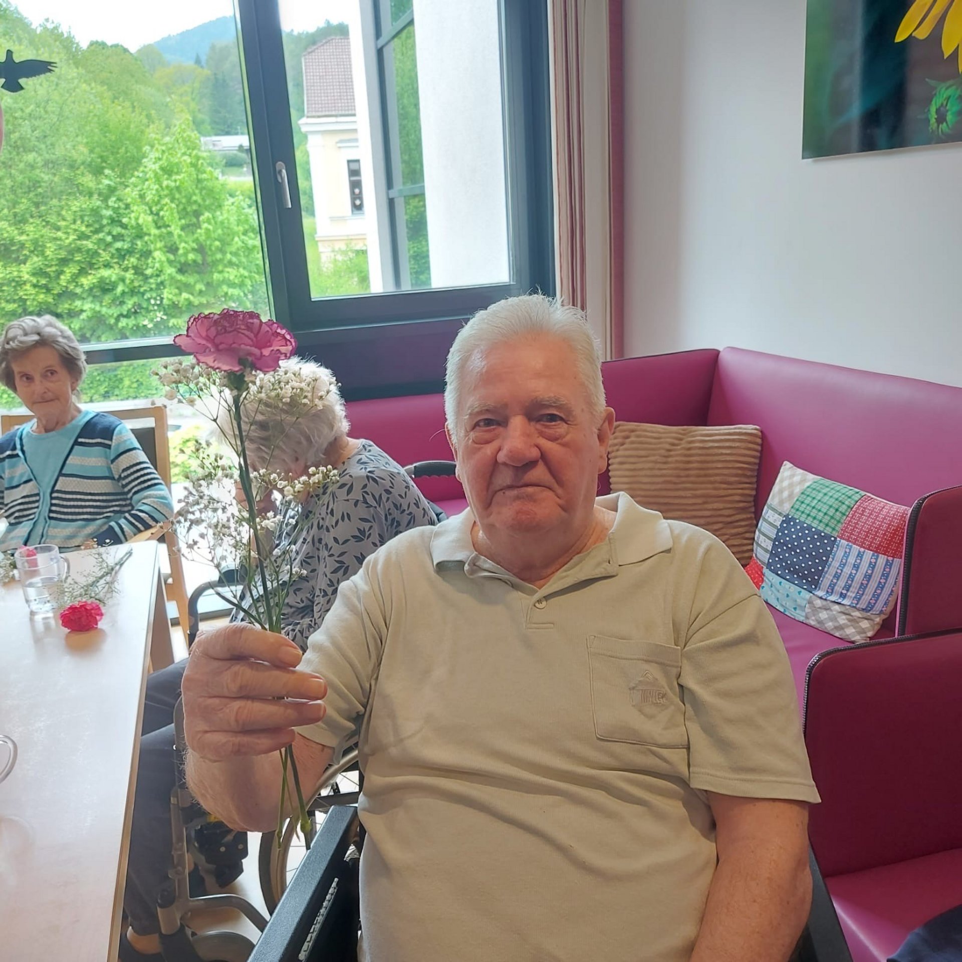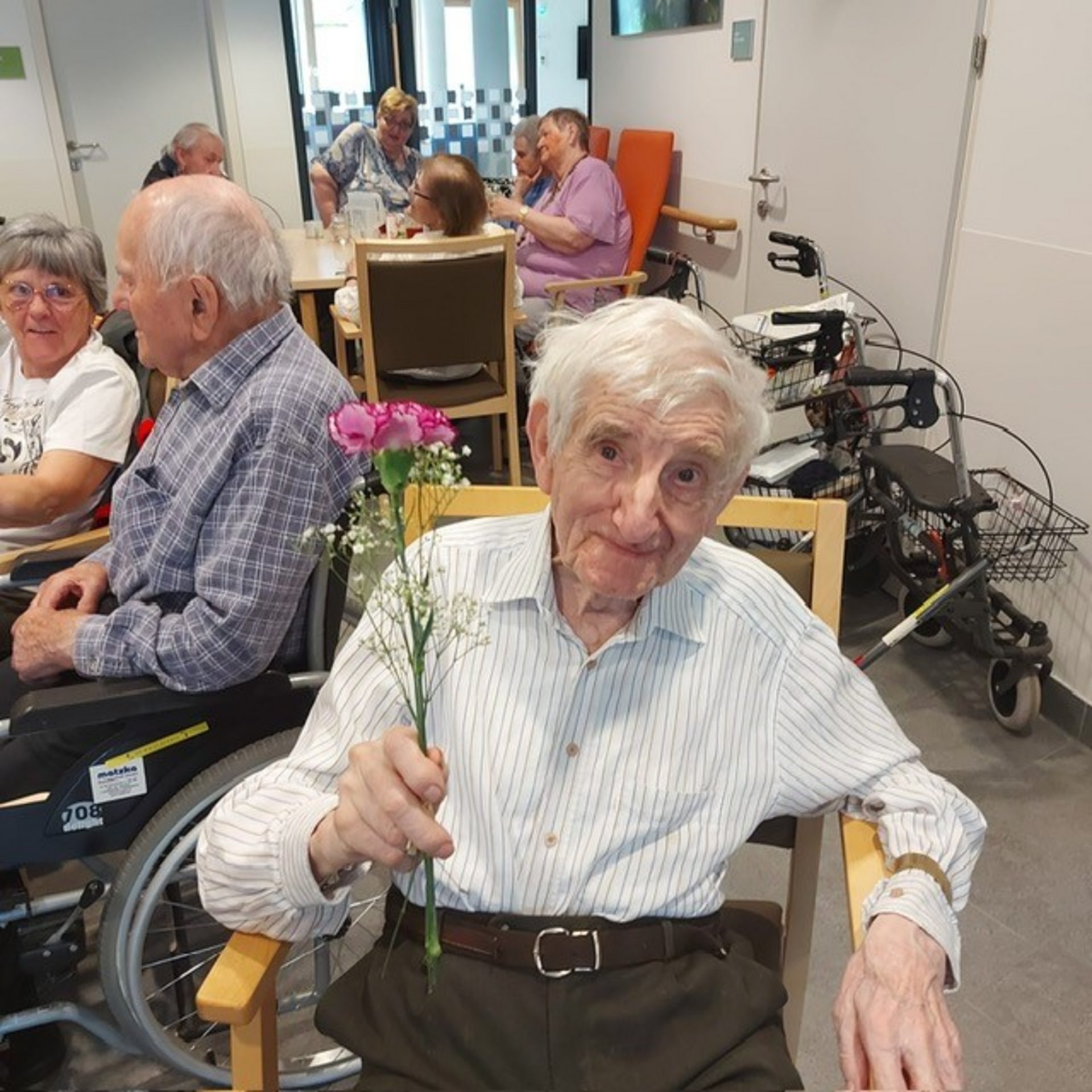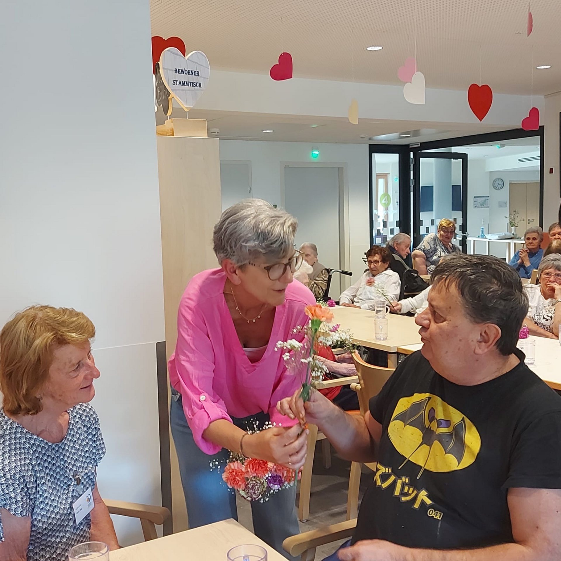 Bewohnerinnen und Bewohner, das Pflegepersonal sowie zahlreiche ehrenamtliche Mitarbeiterinnen und Mitarbeiter kamen zusammen, um diesen besonderen Tag gemeinsam zu begehen. Die Direktorin des Hauses sowie die Ehrenamtskoordinatorin ließen es sich nicht nehmen, persönlich kleine Nelkensträußchen zu überreichen – als kleines Dankeschön und Zeichen der Wertschätzung für Alle im Haus.