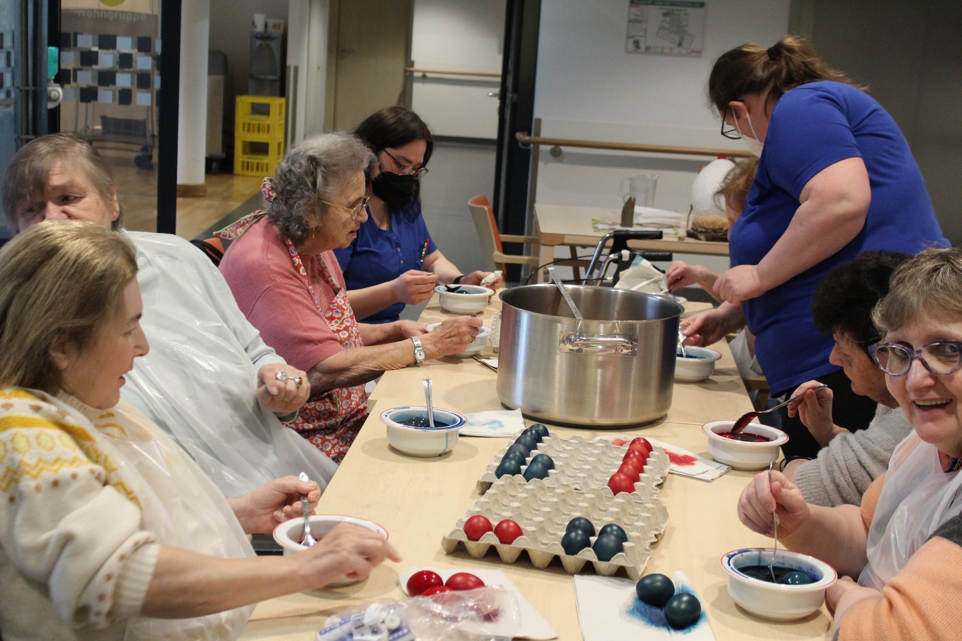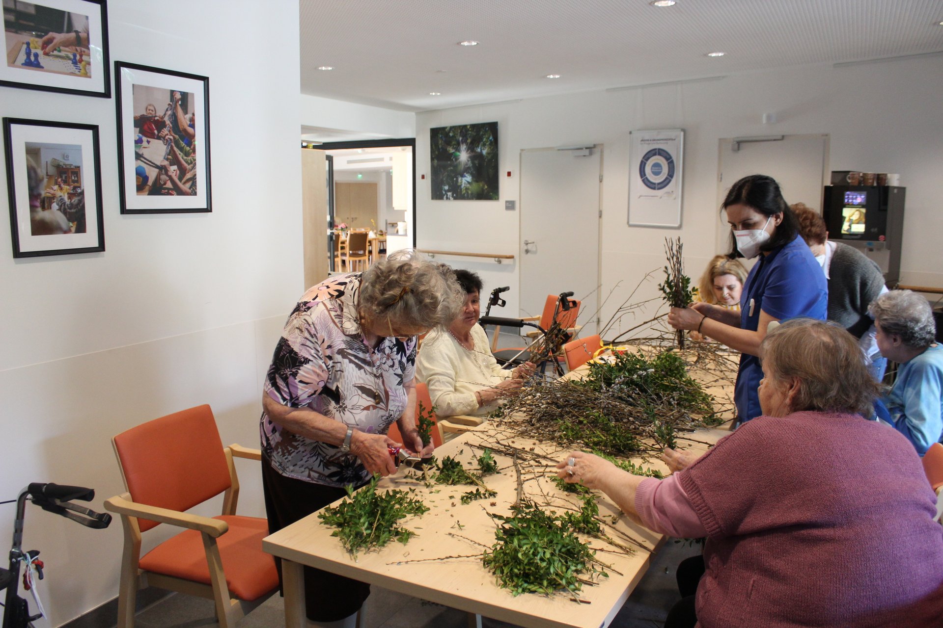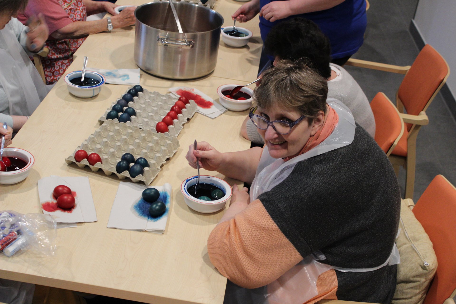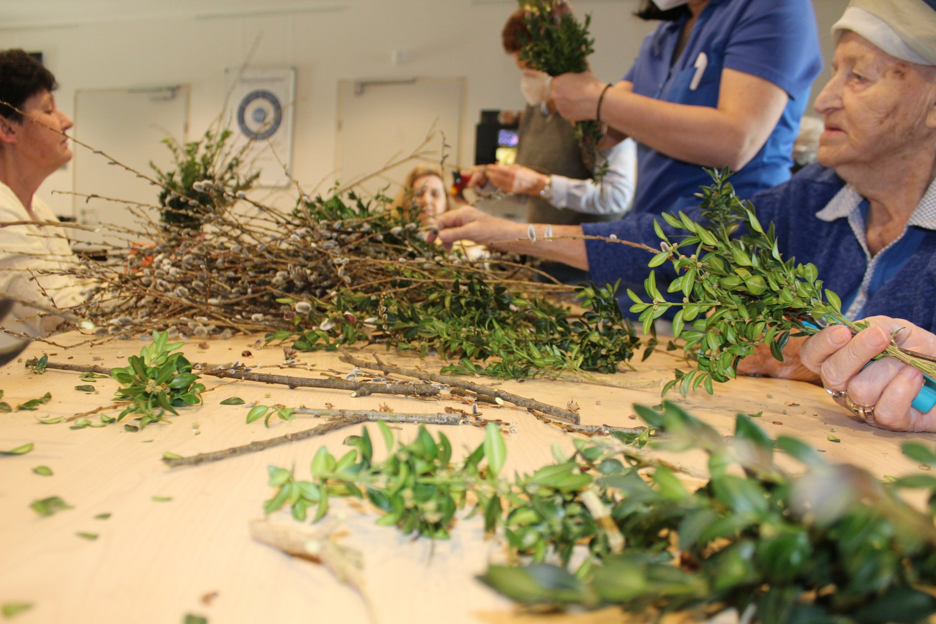 Beim Palmbuschen binden, Ostereier färben und Pinzen backen, kamen unsere Bewohnerinnen und Bewohner in Osterstimmung. Es wurde viel gelacht, gequatscht und auch gearbeitet, um allen ein schönes Osterfest zu bereiten.