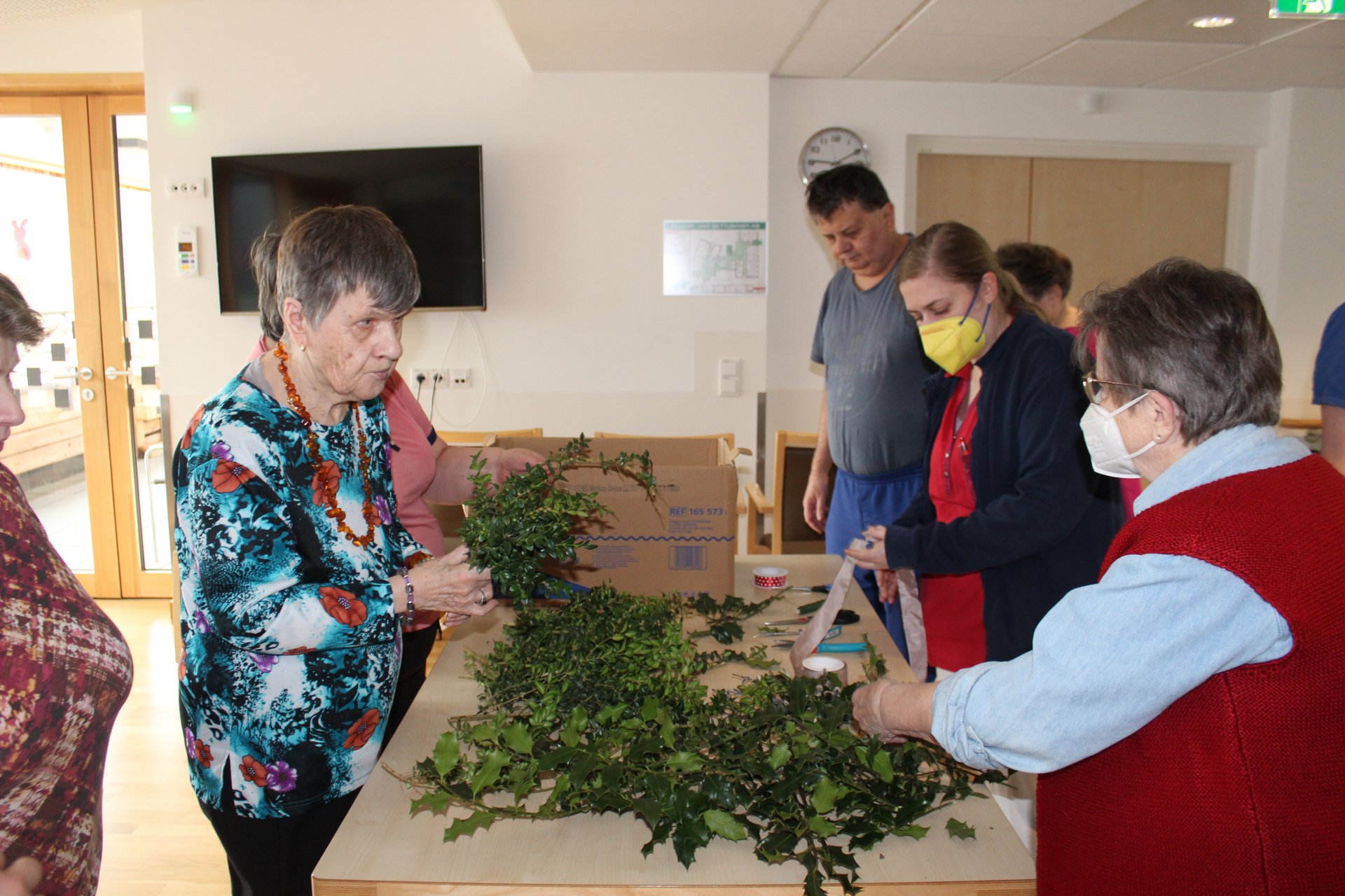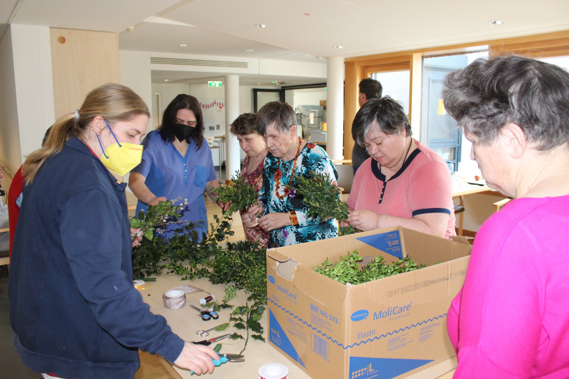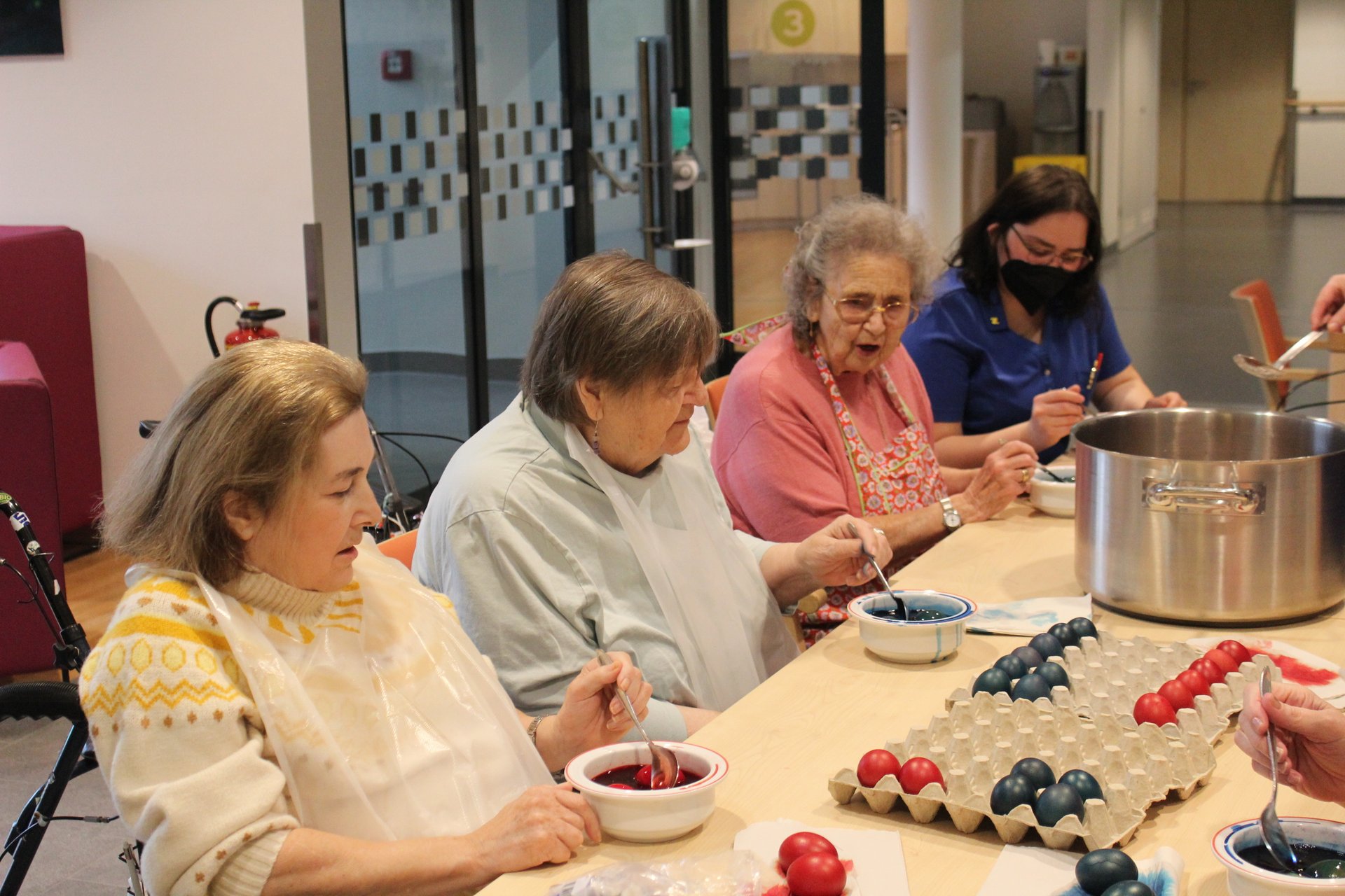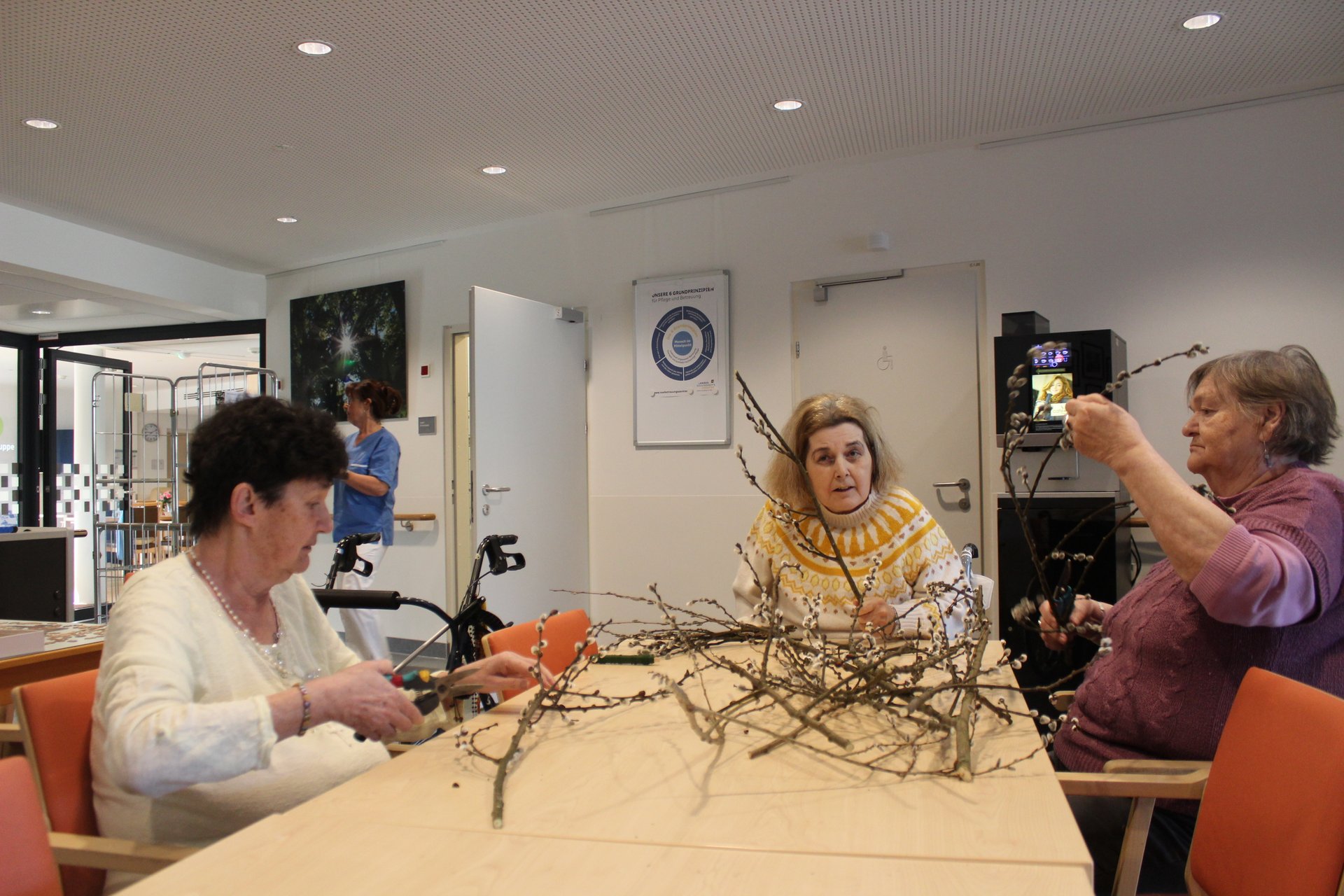 Beim Palmbuschen binden, Ostereier färben und Pinzen backen, kamen unsere Bewohnerinnen und Bewohner in Osterstimmung. Es wurde viel gelacht, gequatscht und auch gearbeitet, um allen ein schönes Osterfest zu bereiten.