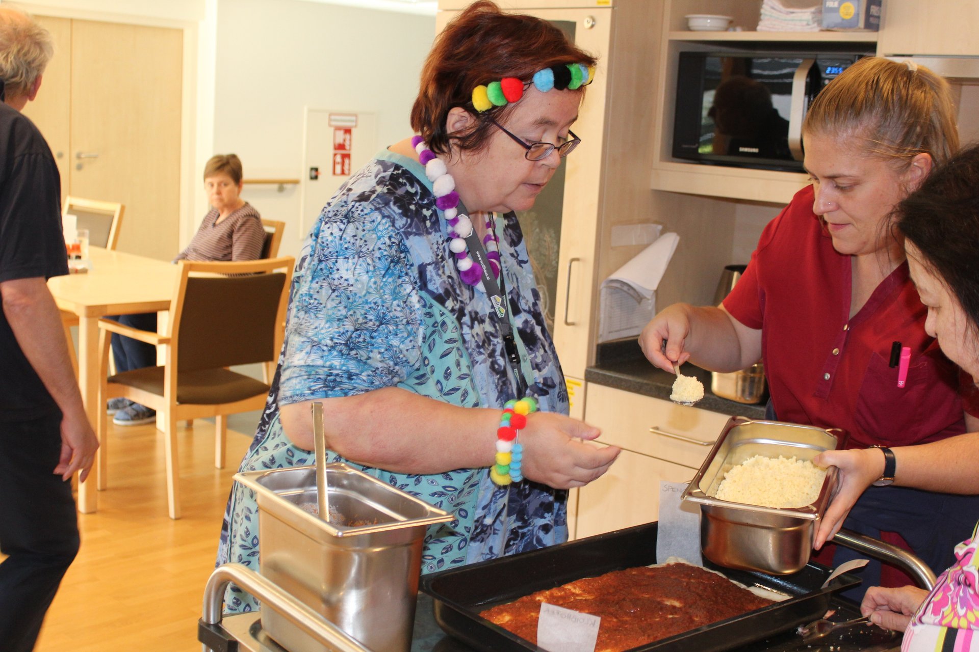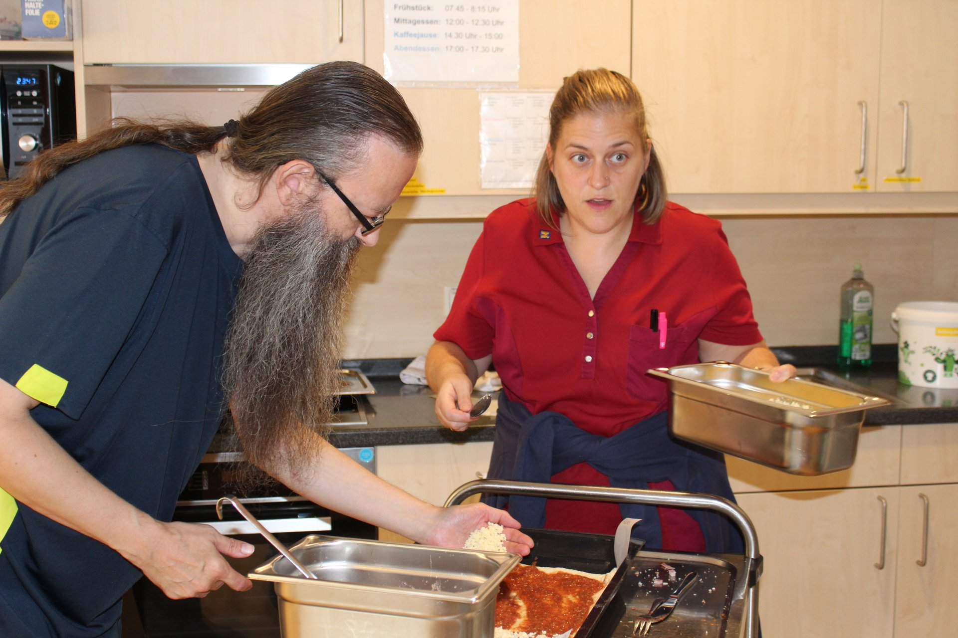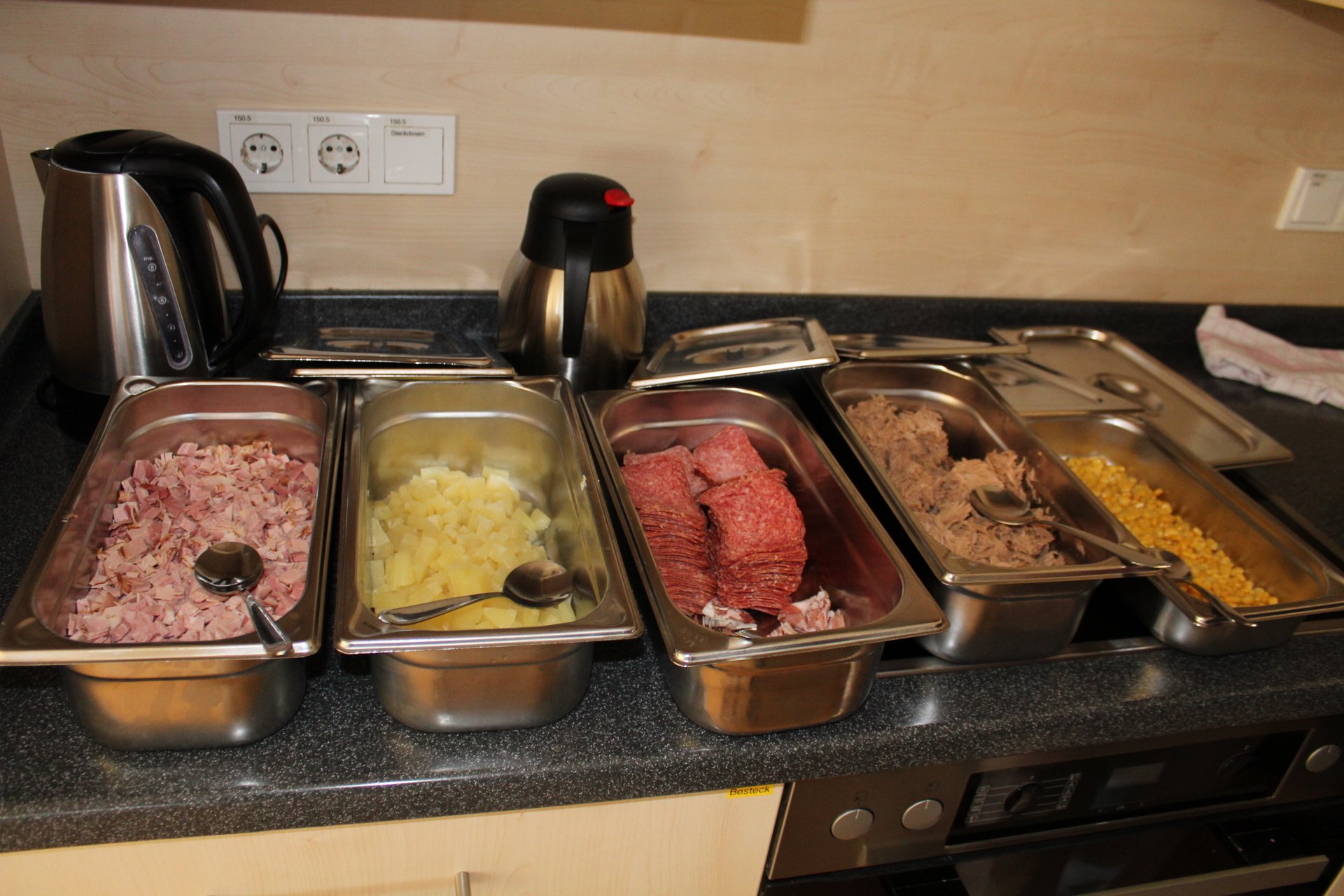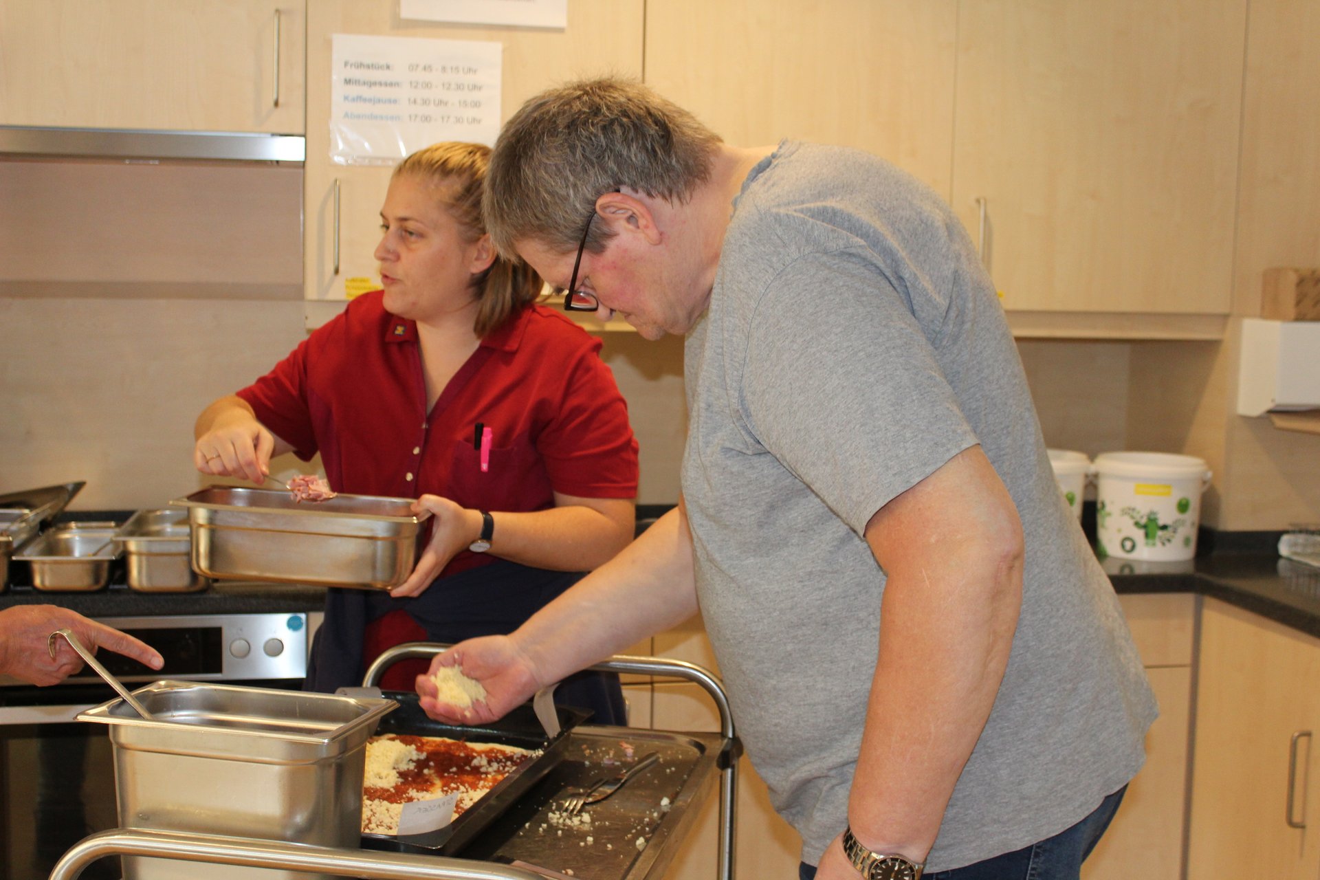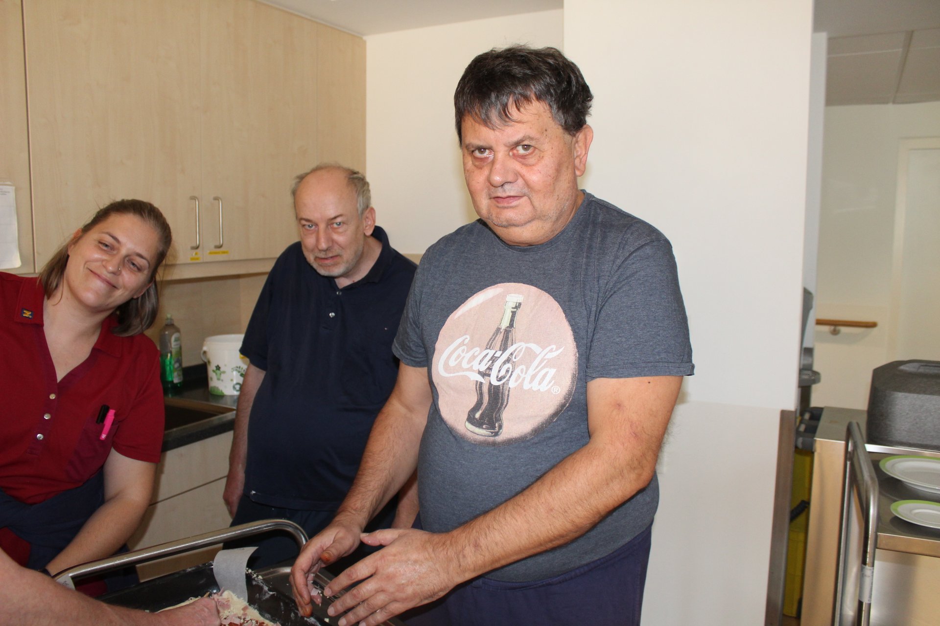 Die Bewohnerinnen und Bewohner der WGs 5 und 6 haben wieder ihre Kochkünste gezeigt, und sich und Ihren WG-Kollegen leckere Blechpizza gebacken. Mit Hife unserer Mitarbeiterinnen und Mitarbeiter wurden viele verschiedene Pizzen gezaubert. Mit frischen Zutaten aus unserer Küche haben Sie sich Ihr "italienisches Brot" mit Mais, Ananas, Wurst, Speck, Thunfisch, Sardinen oder nur Käse belegt. So kamen viele unterschiedliche Variationen zu Stande und alle freuten sich auf die frisch duftende Leckerei.