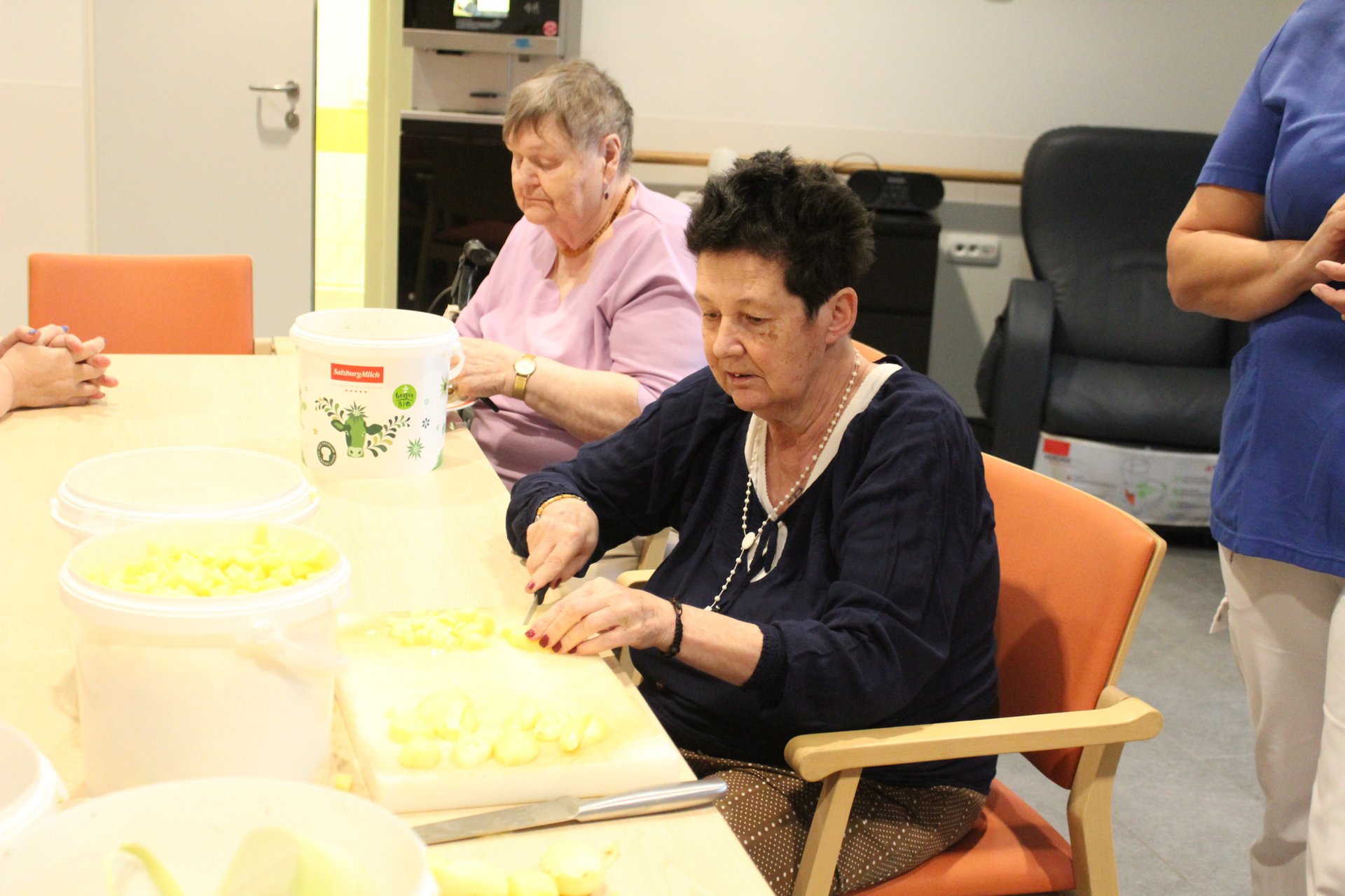 Im Frühjahr bereiteten unser Haustechniker, Herr Harald Köberl, und unser Zivildiener, Herr Fabian Dörrich, mit kräftiger Unterstützung der Marktgemeinde Türnitz unseren Garten her, um die neue Erdäpelpyramide für unsere Bewohnerinnen und Bewohner aufzustellen. Die Pyramide wurde von der Firma Manfred Krcmar gespendet. Nach dem Aufbau und befüllen mit Erde, wurden sogleich von unseren Bewohnerinnen und Bewohnern die ersten Pflanzen eingesetzt. Mit viel Elan wurde „gegartelt“ und über den ganzen Sommer hinweg wurden die Pflanzen gehegt und gepflegt. Im Herbst war es dann endlich so weit und die Erdäpfel wurden geerntet. Voller Stolz schmückten sie bei der Erntedankmesse, gemeinsam mit Blumen aus unserem Garten, den Altar. Um sie dann auch vollständig zu verwerten, wurde von den Bewohnerinnen und Bewohnern gemeinsam mit dem Team der Alltagsbegleitung, eine köstliche und nahrhafte Erdäpfelsuppe gekocht.